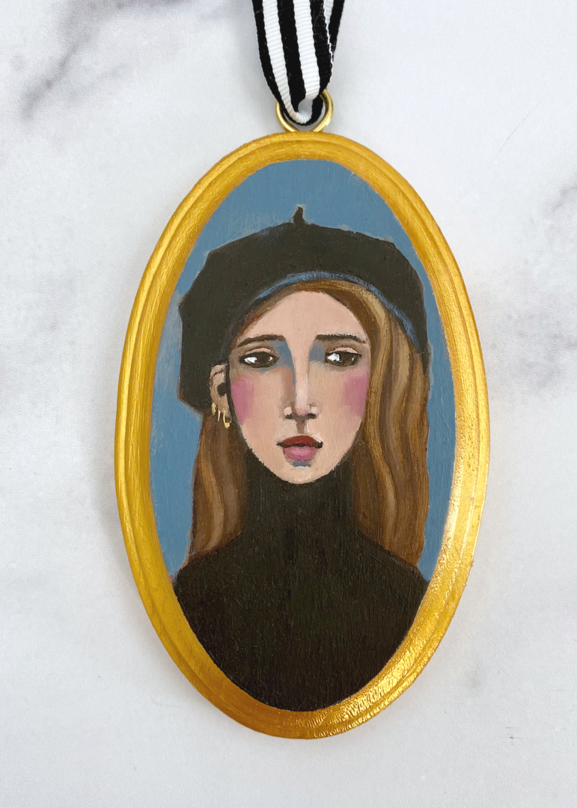 Girl With a Black Beret3" by 5" oil and cold wax on wood,ribbon included$90Free shipping
