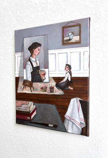 Alone with her self-portrait, the artist sits on the floor, searching its painted eyes for something she can’t quite name. In that quiet moment, she realizes the answers she’s been seeking are not in the canvas, but in the act of truly seeing herself.