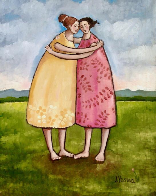 This piece honors the profound strength of female relationships. Amidst a peaceful meadow, two women embrace, capturing the deep comfort, unwavering support, and unbreakable bonds between women.