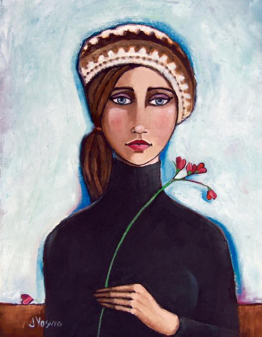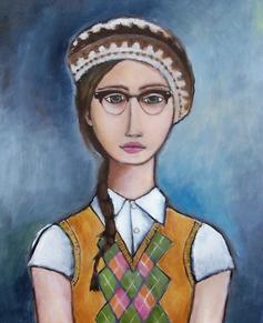 The small image here is the first draft of this painting. I called her "Jr. High Girl." Even though she grew up, she still wears the hat she wore in jr. high.