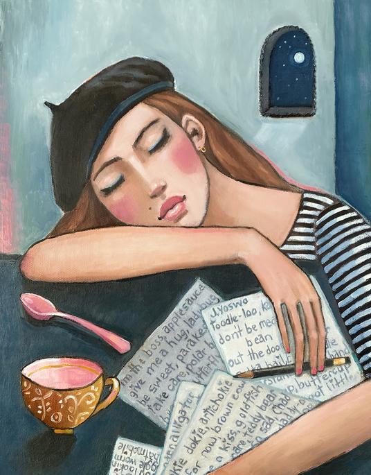 I love poetry. I read it, and I paint it. My intentions for this piece were to show a poet hard at work putting her deep thoughts on paper. She appears exhausted from all the prolific prose. But I love contradictions, and I just couldn’t take it, so I changed her writings to nonsense, and now I’m smiling. I LOVE this sleepy poet.